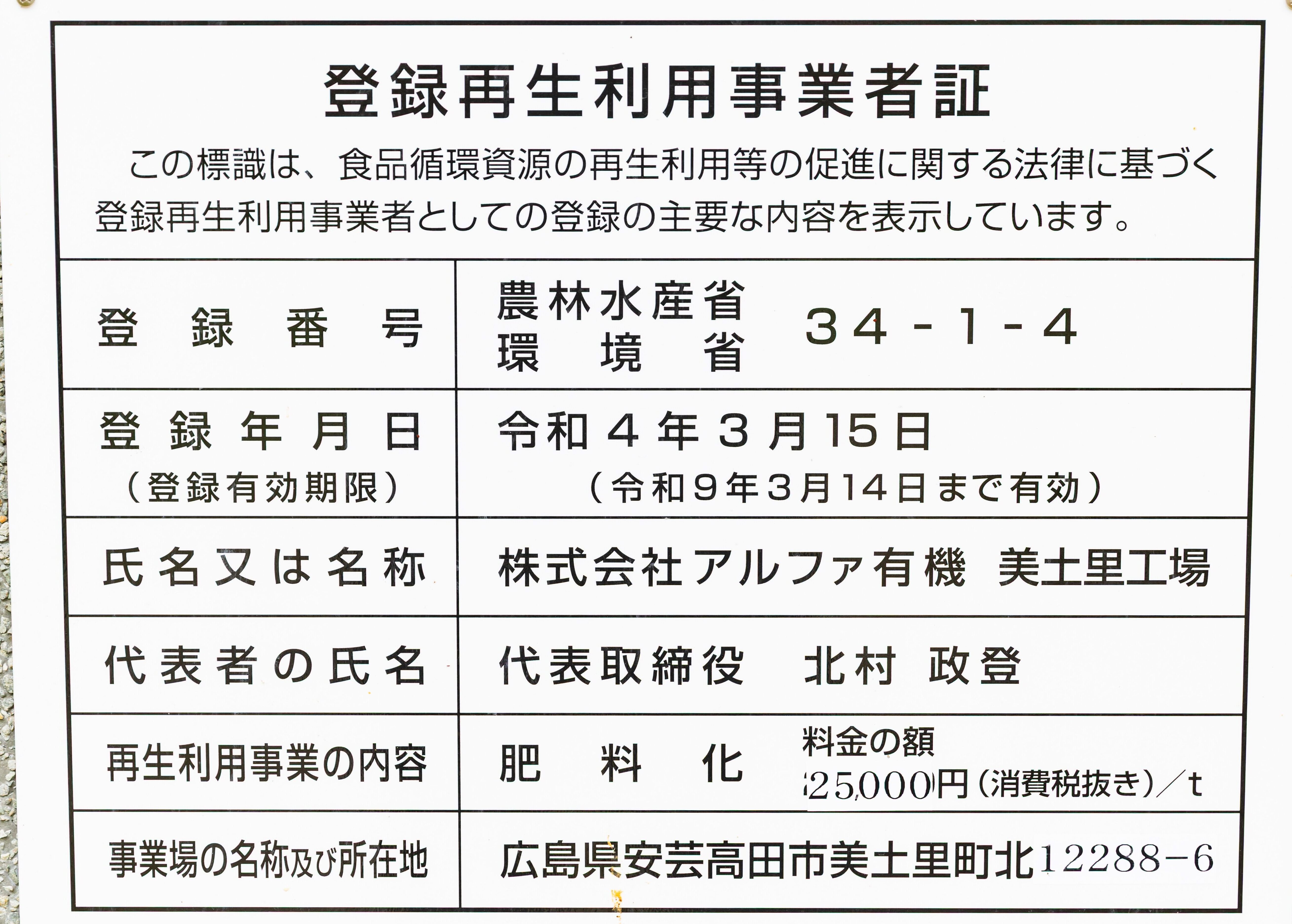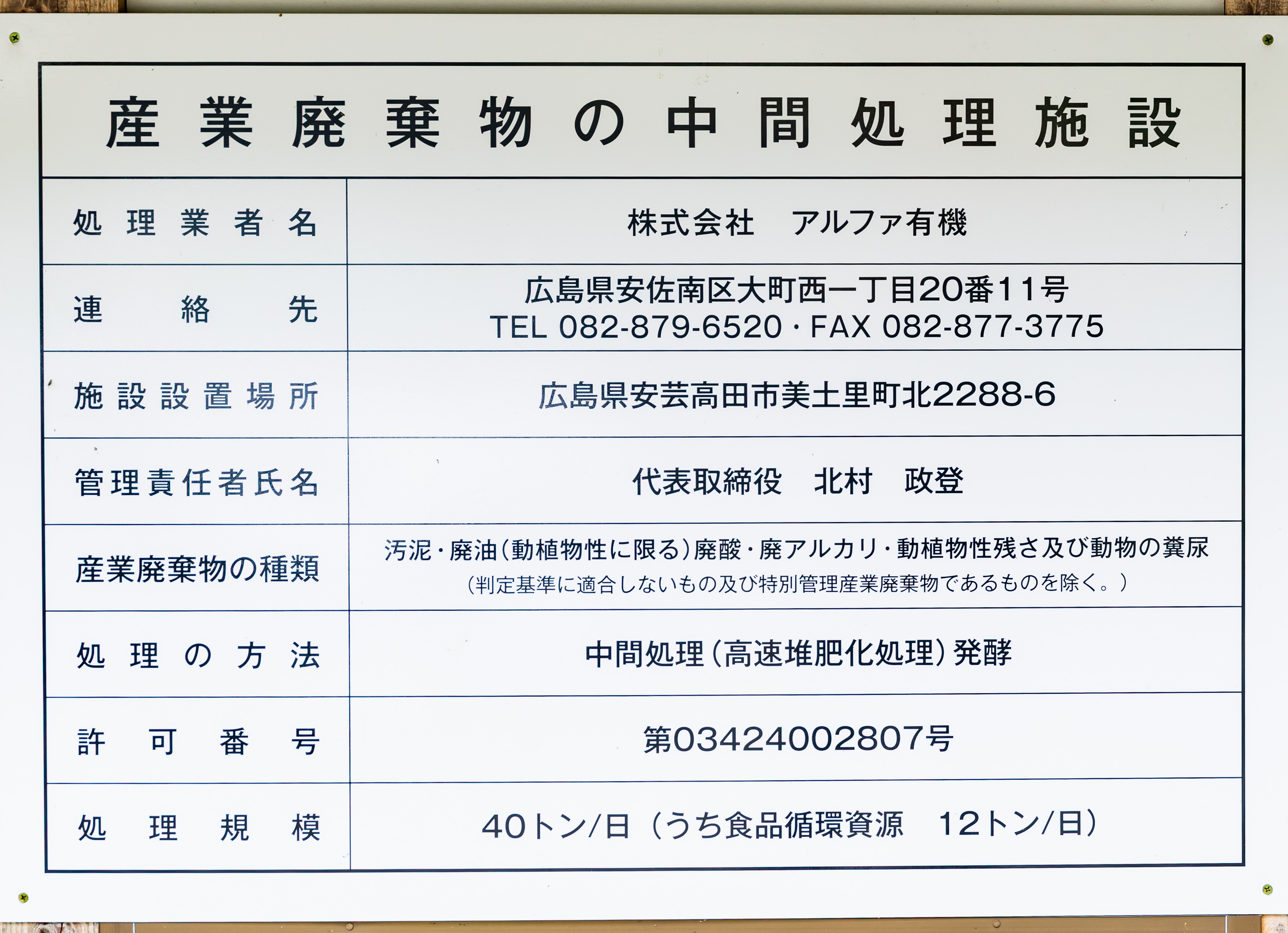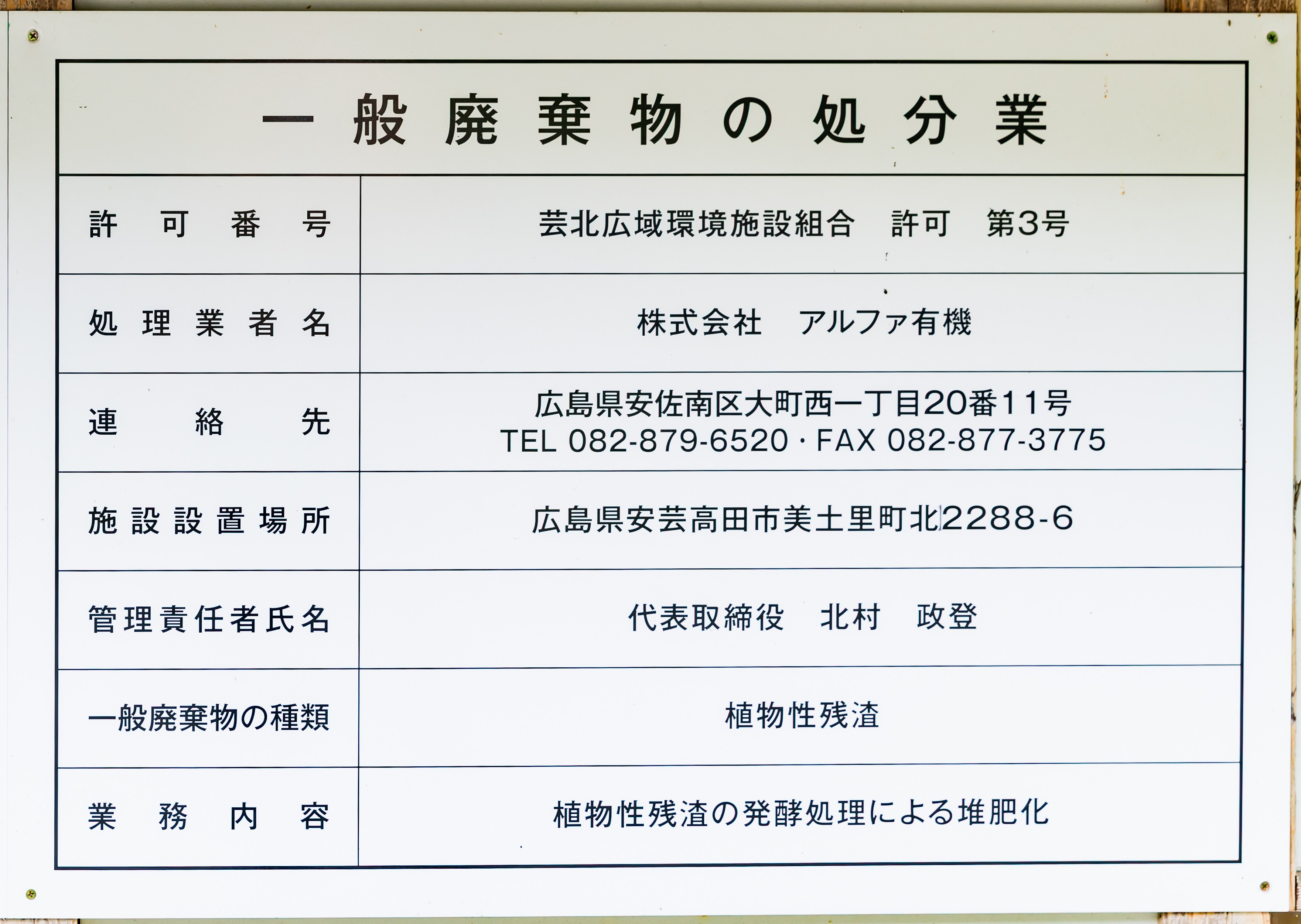 | 許可番号 | 広島県産業廃棄物処分業 第3424002807号 広島県産業廃棄物収集運搬業 第3404002807号 広島市産業廃棄物収集運搬業 第7300002807号 山口県産業廃棄物収集運搬業 第3501002807号 島根県産業廃棄物収集運搬業 第3200002807号 福岡県産業廃棄物収集運搬業 第04000002807号 一般廃棄物処分業(芸北広域環境施設組合) 第3号 |